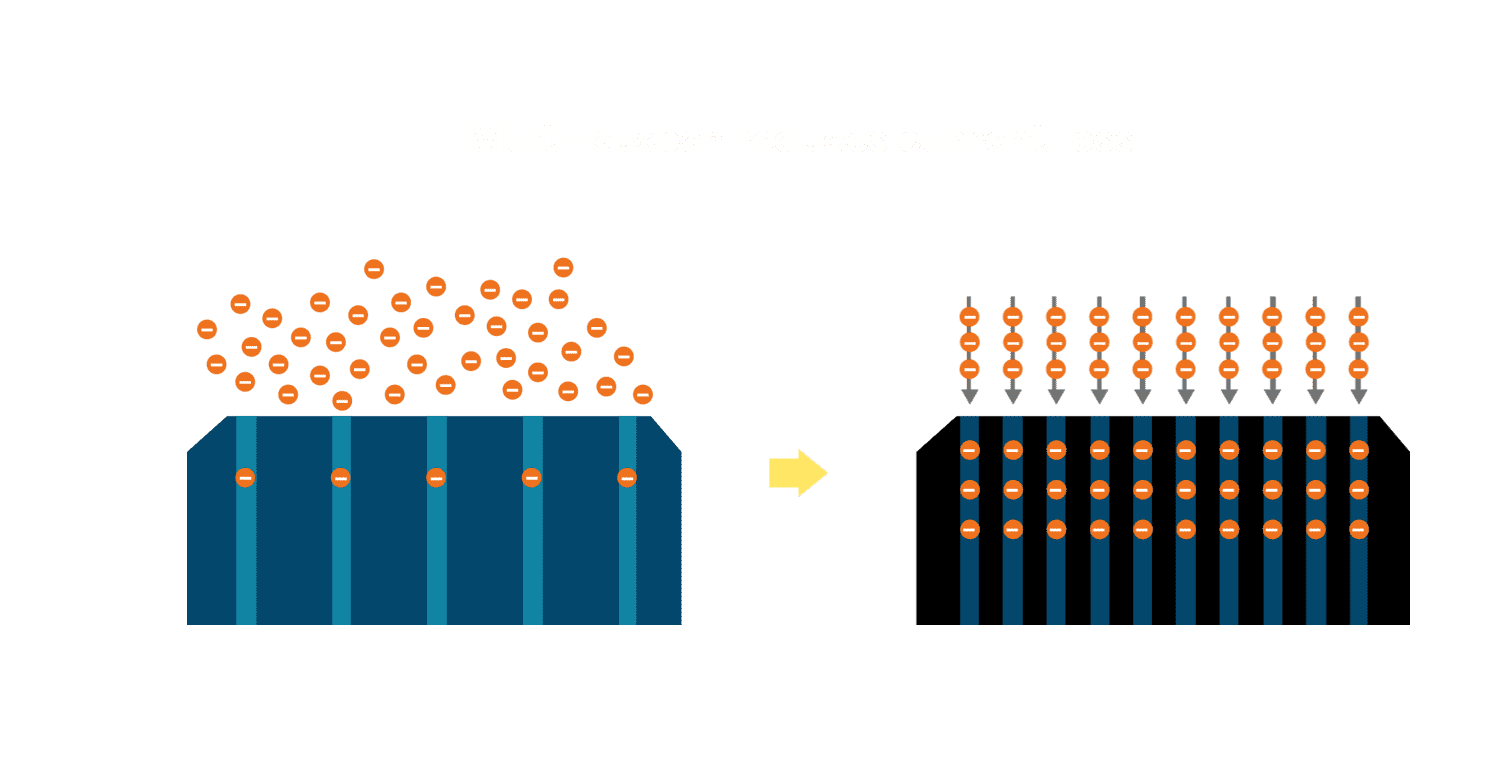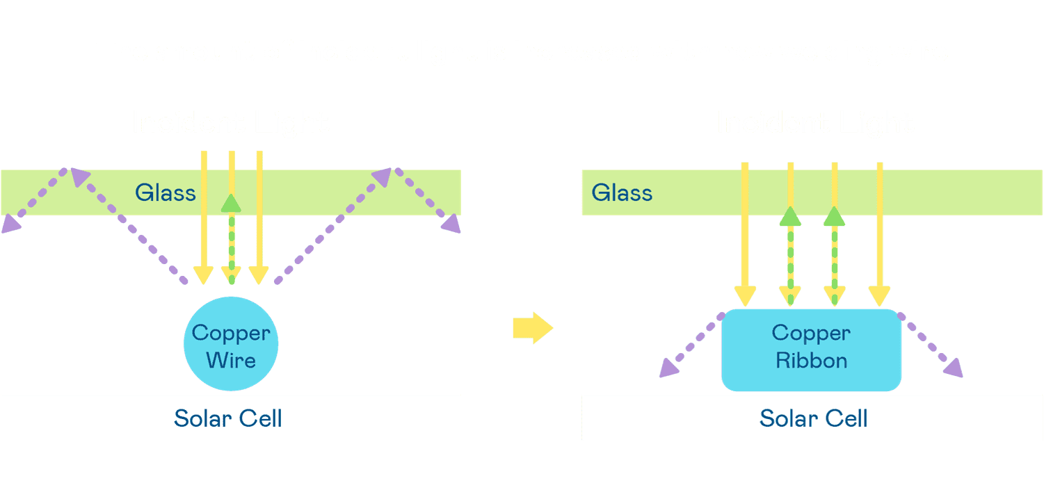 - 电池使用多条铜导线 (Copper wire) 于电池片上形成较短的电流路径,,,,提高电流收集效率,,采用圆形设计的铜导线较传统扁平式的铜焊带 (Ribbon),,,可增加入射至电池的光线量。。。。