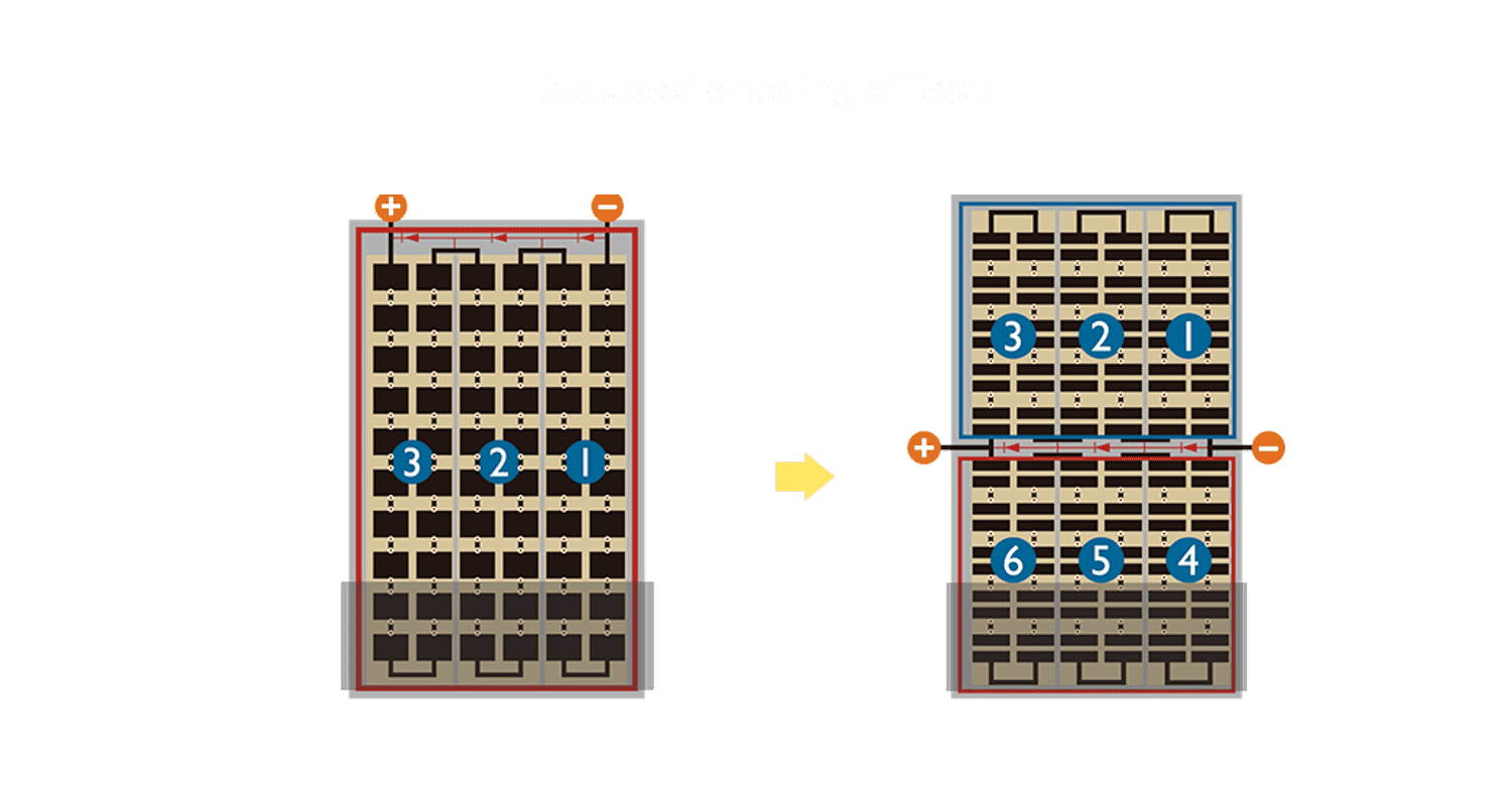 - 结合半切电池,,降低遮阴影响、、提升模组抗隐裂能力、、并减少电阻损耗,,,进一步提升模组发电效能。。。